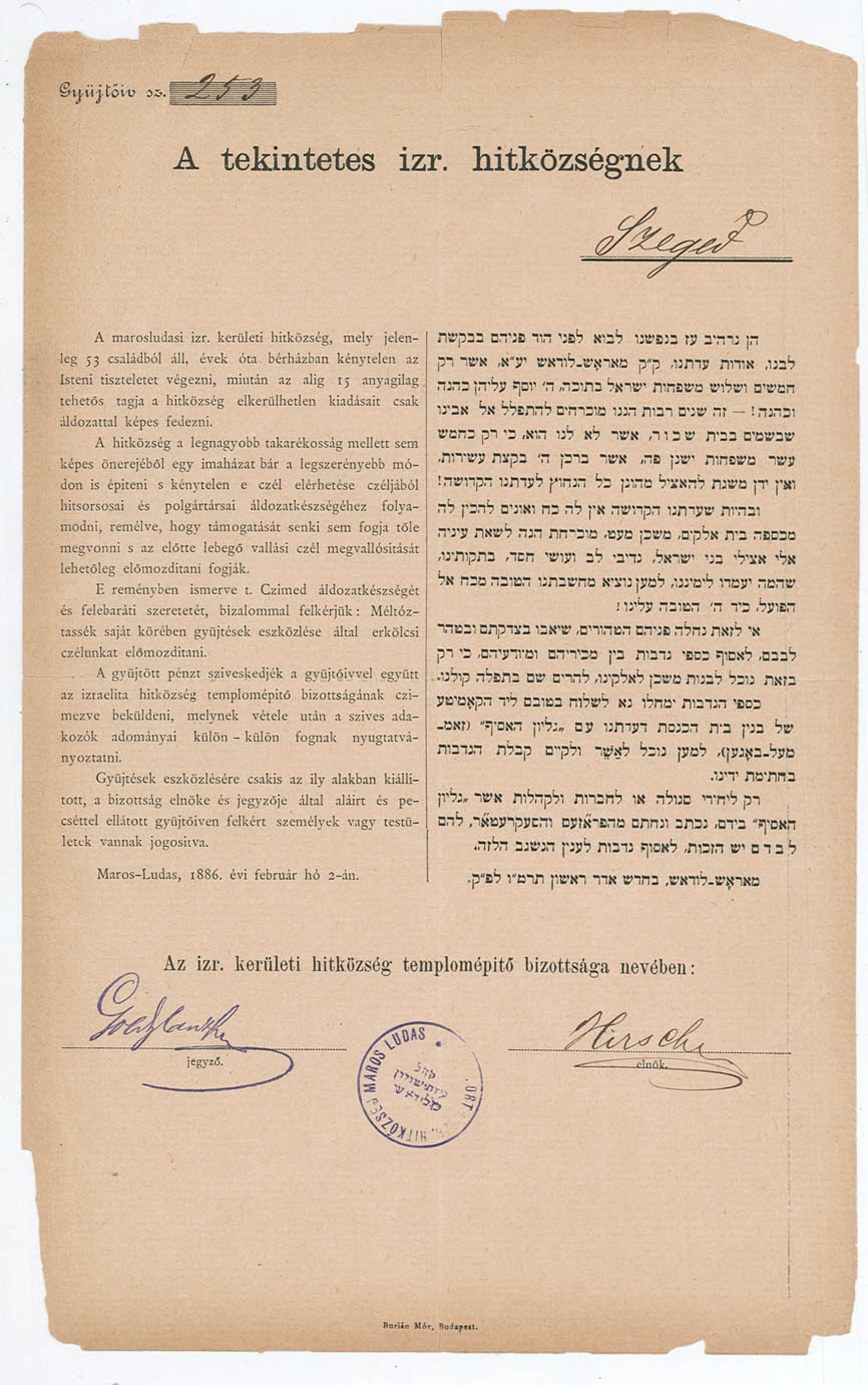 In memory of Herbert Offen, the Offen family has donated a rare Hungarian-Hebrew document to the YIVO Archives. The Jewish community of Maros Ludas, located in Transylvania near the Maros River, had only 53 Jewish families. They could not afford to build their own synagogue and had been praying in rented quarters. In 1886, because of their limited financial means and their desire to have their own synagogue, they formed a Building Committee and distributed a fundraising appeal to more affluent Jewish communities and individuals throughout Hungary. To prevent fraudulent fundraising, only those who personally received the signed form and were in possession of it were authorized to raise funds, and each donation had to be certified by the officials of the Maros Ludas Jewish community. On the reverse is a form for recording donations and names of donors. This particular form was sent to the Hungarian Jewish community of Szeged, in South Central Hungary in the hope that that community would contribute funds.
